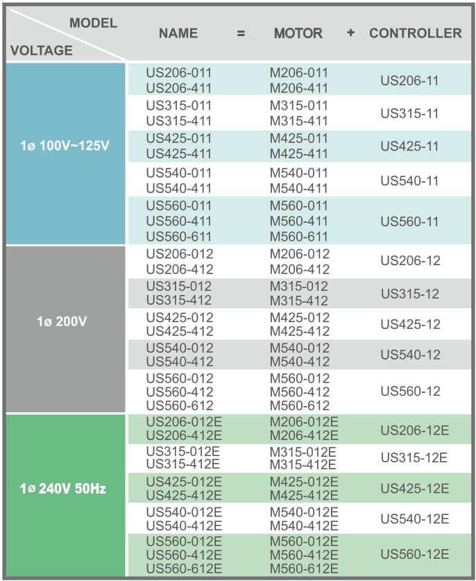 standardmäßige (unidirektionale) asynchronmotoren, getriebemotoren und drehzahlregler als kombination in einer tabelle